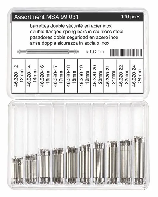 1.80mm Double Flange Spring Bar Assortment Stainless Steel, 100 pcs