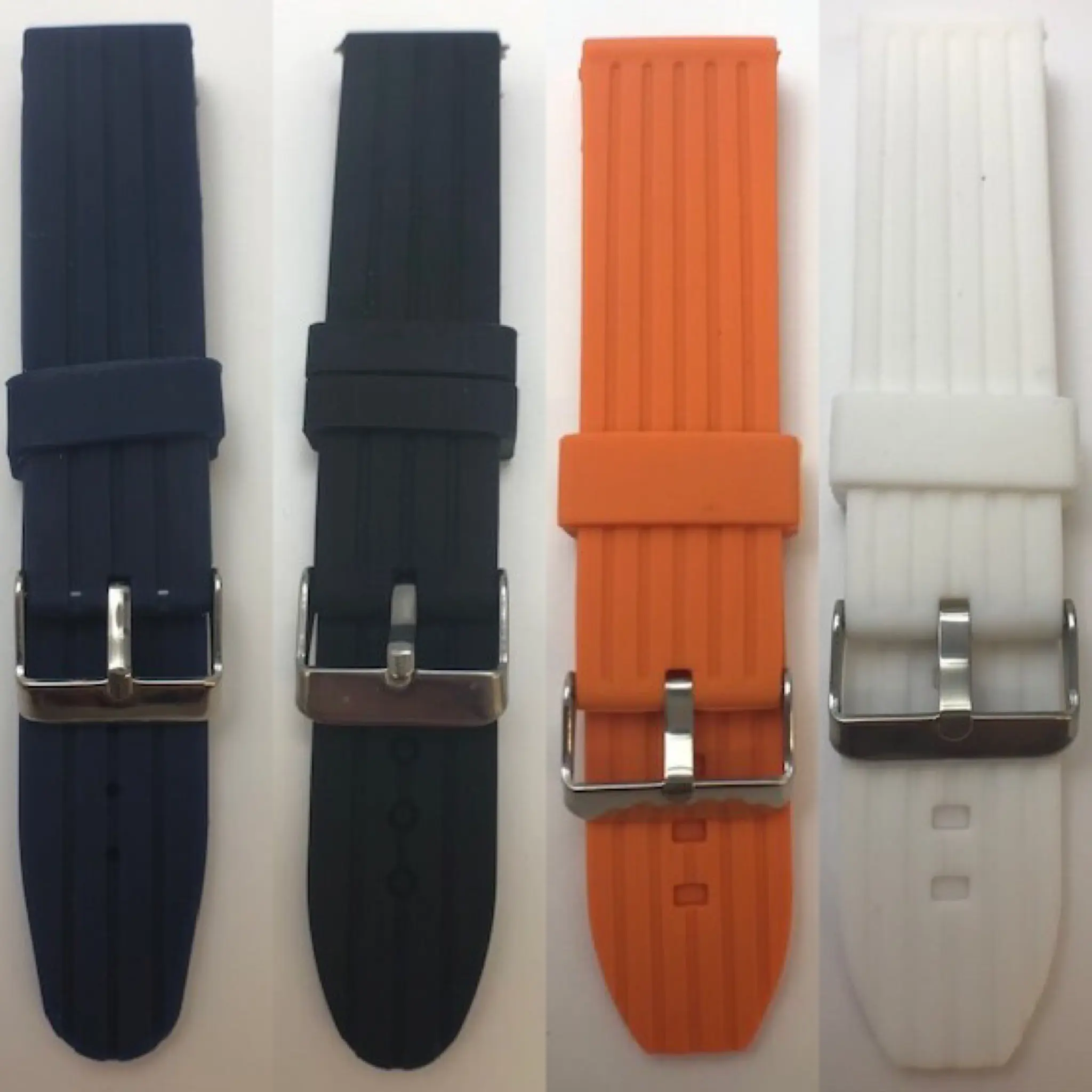 20mm Silicone Flexible Watch Strap. Stainless buckle. Choose from black, navy blue, white or orange.