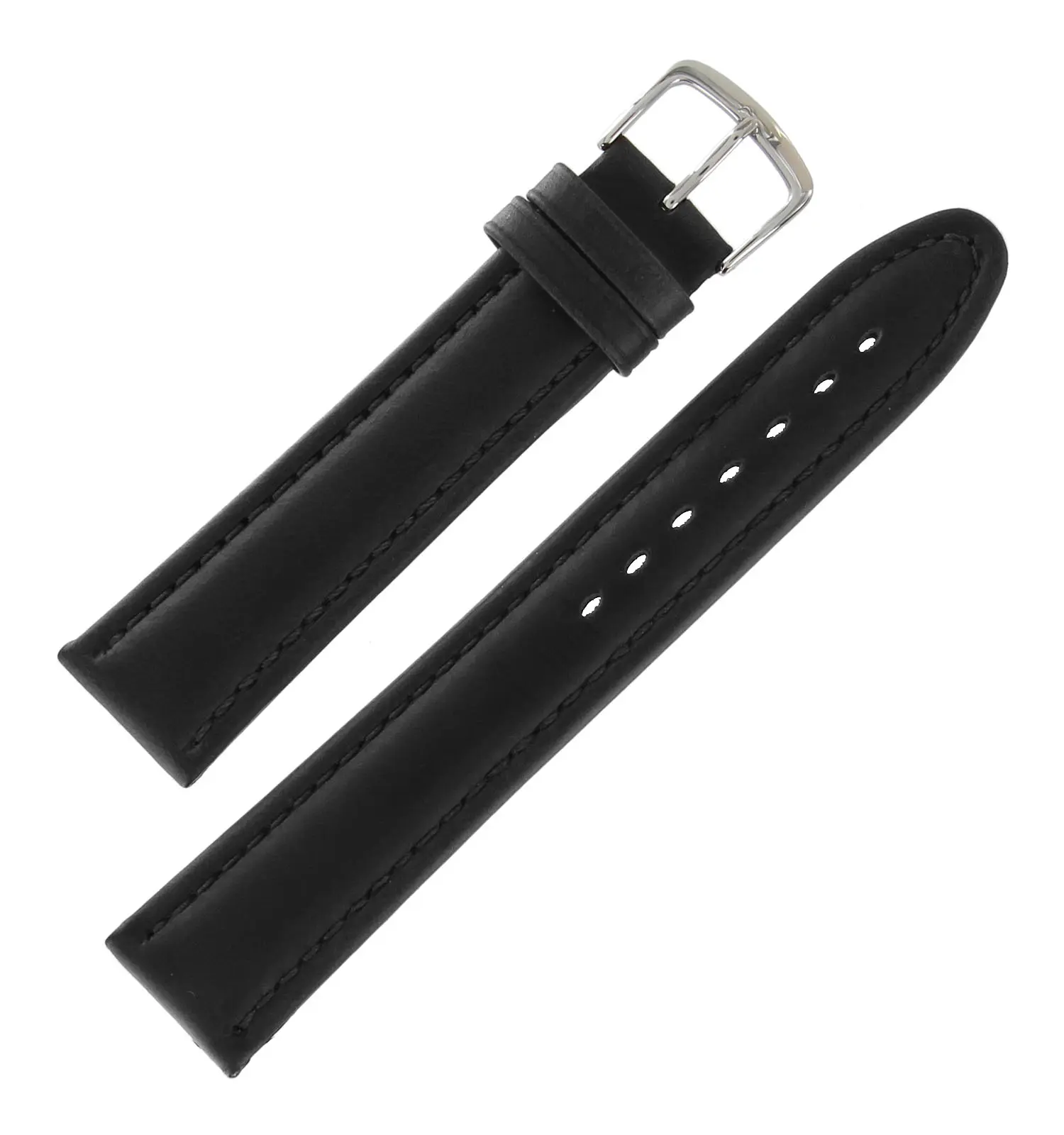 22mm Oilskin Chrono Black Leather Strap. Features heavy padding, matching stitching, tapered edge construction and comes with a stainless steel buckle.