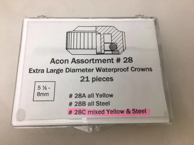 5.50-8.00mm Waterproof Crown Assortment, White & Yellow, 21 pieces. Sizes include: