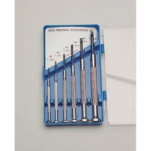 The blades are tempered for long life and set firmly in plated handles with swivel heads. Sizes of screwdrivers included in the set are: 1.00 1.40 2.00 2.40 3.00 and 3.50mm.