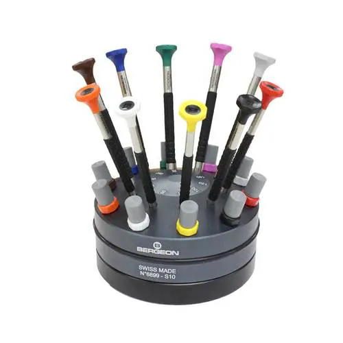 Ten stainless steel screwdrivers, black elastomer grips. Special alloy blades from .50mm to 3.00mm. Heavy base, 90mm
