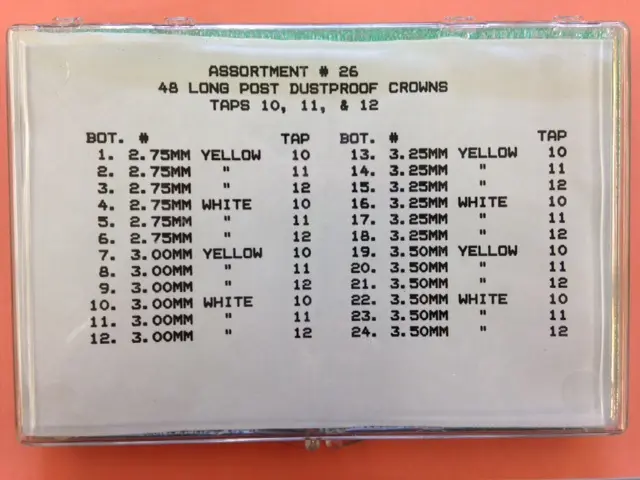 Dustproof crown assortment w/Long posts for all popular sizes. Crown diameter 2.75-3.5mm. 48 pieces. one each white and yellow of 24 different sizes. Refills available separately.