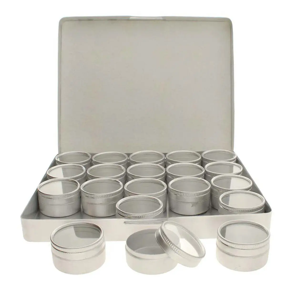 Durable aluminum compact case with 20 round jars. Perfect for watch parts, beads or other small items. Each jar measures 1-3/10″ x 3/4″. Case measures 6-3/4″ x 5-1/2″ x 1″