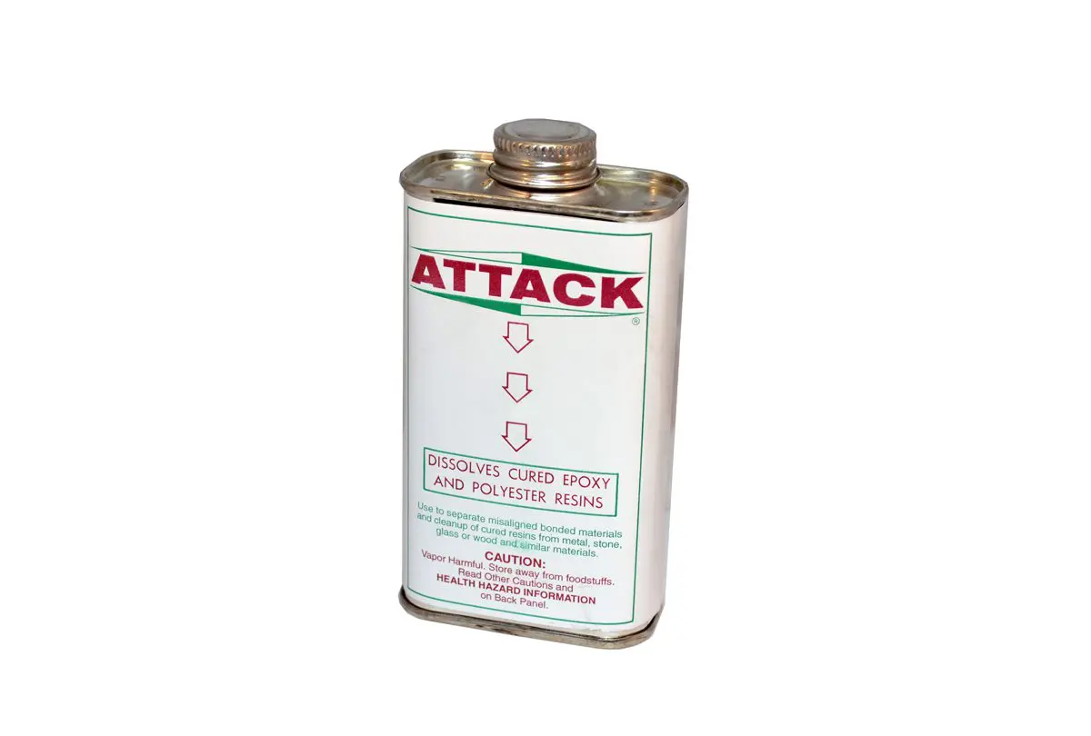 Attack Glue Dissolver, 8 Ounces. Dissolves cured epoxy and resins so you can quickly and easily separate misaligned materials or clean cured resins from metal, stone, glass, wood and many other materials.