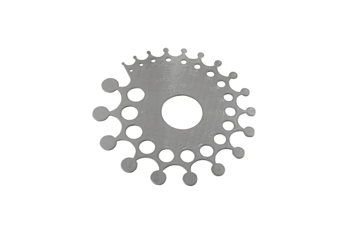 The holes in the gauge are used to measure stones, while the extensions are used to measure mountings. One side shows millimeters, the other side shows the corresponding carat measurements.