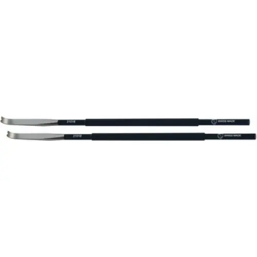 Made of hardened steel with mirror polished tips. Notched for easier positioning. Anodized aluminum handles. Tips are 2.5mm wide by 0.15mm thick. These are probably the best hand levers on the market.