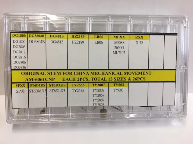 13 styles, 2 pieces each, 26 pieces total of the most popular Chinese Mechanical Movement stems. Includes the DG & TY series and many more!