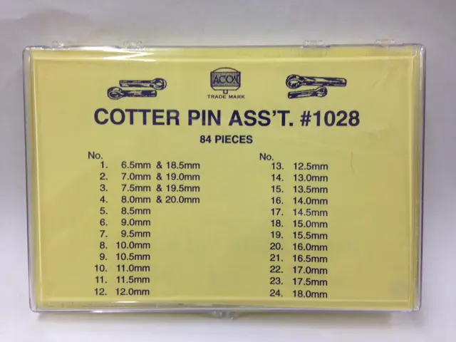 Acon cotter pin assortment #1028. 28 sizes, 3 pieces each size. Sizes range from 6.5-20.0mm. Refills available separately.
