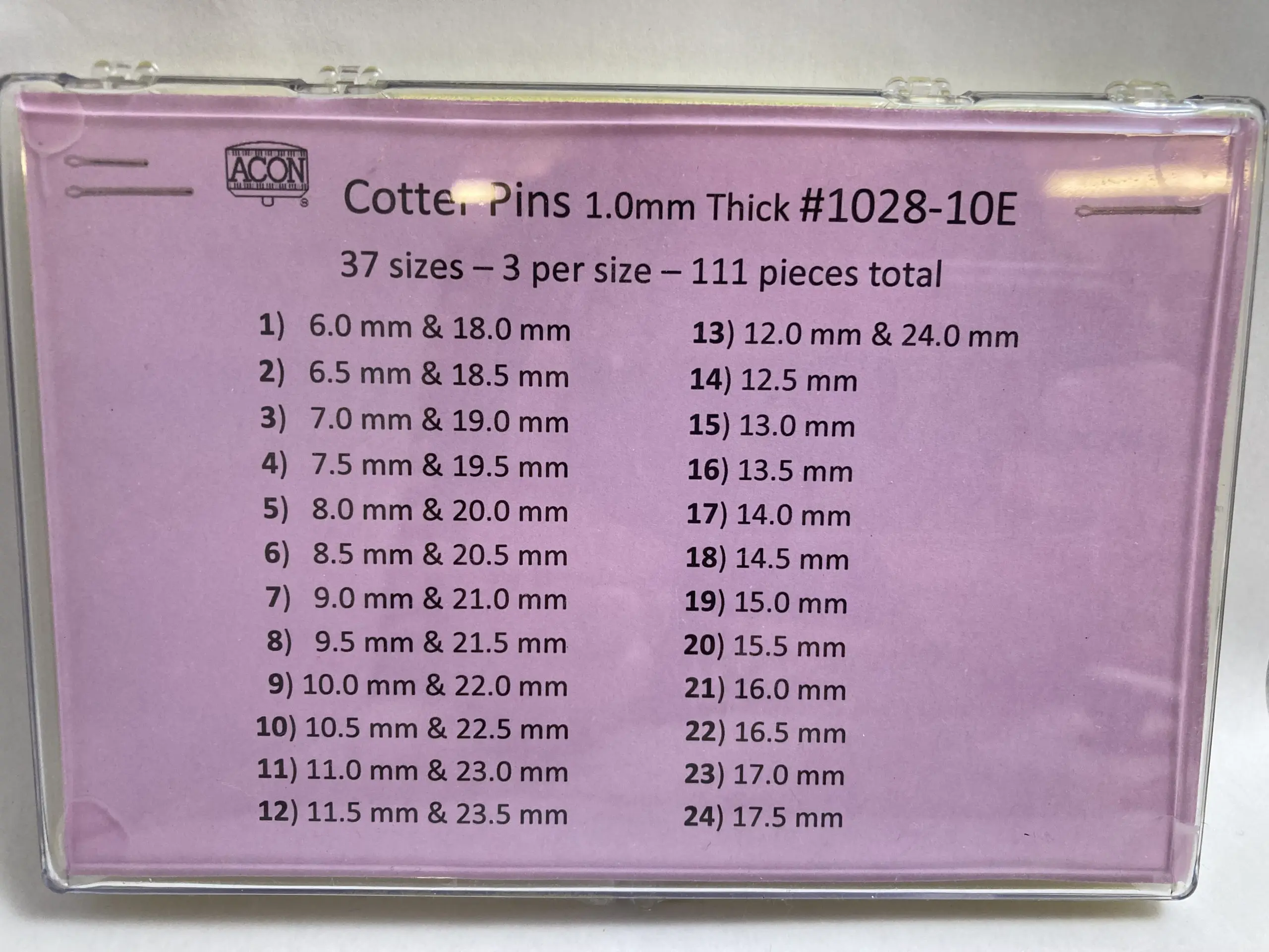 Acon Cotter Pin Assortment #1028-10E. 37 sizes, 3 pieces each size. Sizes range from 6.0mm-24.0mm. Refills available separately.