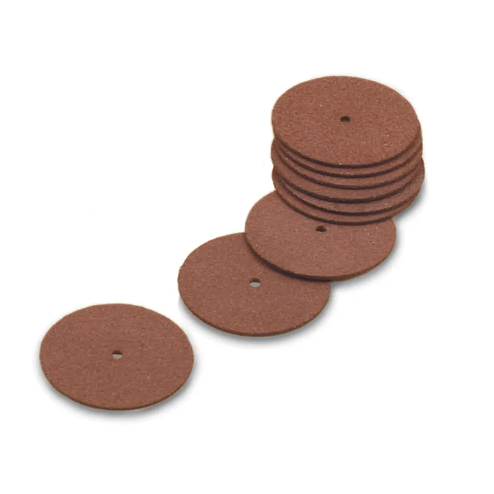 Made of rubber-bonded aluminum oxide grains. Excellent for sprue removal and other cut-off operations. Mount on mandrels. Sold in box of 100.
