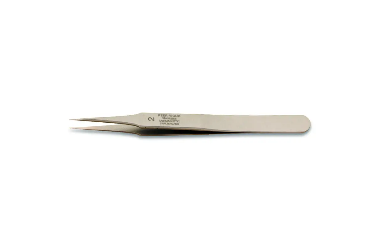 General use tweezers with sturdier points slightly wider and thicker tips than pattern No. 1. Indented and have flat edges for gripping object with tip or side. The plain finished points have a fine tip.