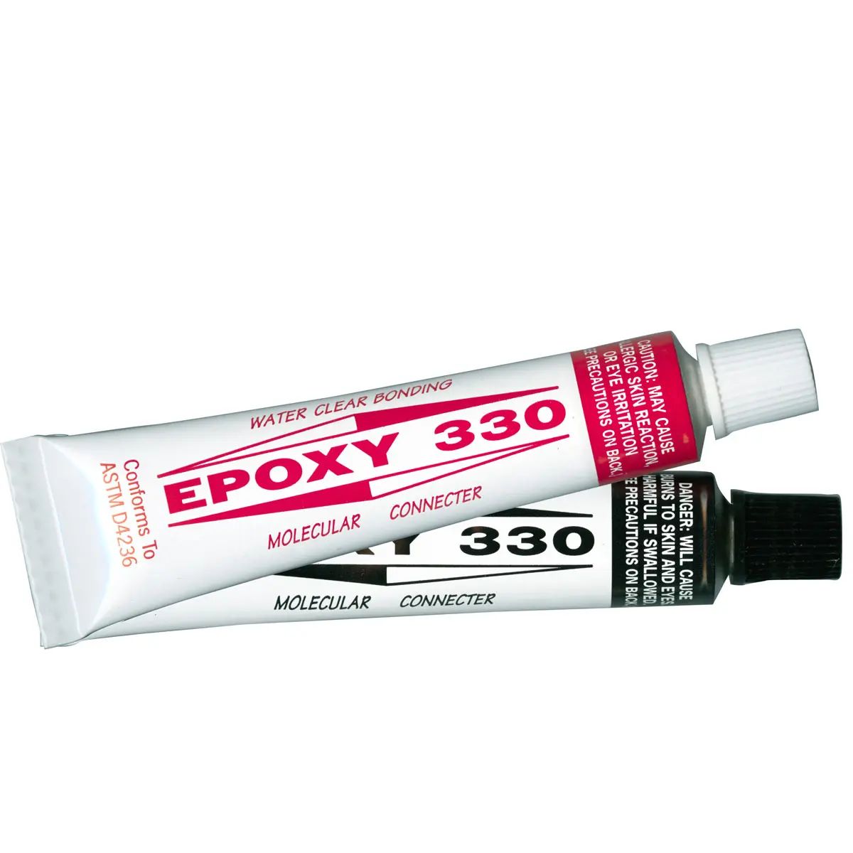 Fast setting, two-part epoxy that sets in 15 minutes and hardens in two hours.  Stays perfectly clear. It can be used to invisibly bond glass, china, ceramics, stone, metals, and other non-porous materials.