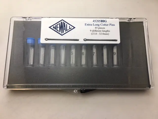 Newall Extra-Long Cotter Pin Assortment. 9 different sizes, 5 pieces each size. Sizes range 23.0-32.0mm. Refills available separately.