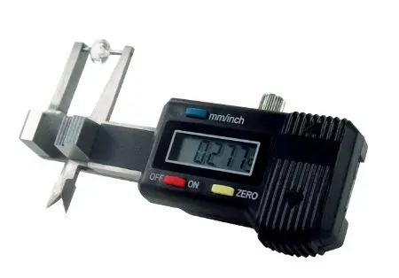 The portable GemOro SUREgauge XL has a measuring range of 0-25mm/0-1″ with a precision accuracy of 0.01mm/0.0005″. This easy to use gauge also comes with a High Setting attachment, great for measuring stones in ring settings. The LCD digital display is operated with three control buttons, a Blue mm/inch Button, Red on/off button and Yellow Zero Adjustment Setting button. On the top side of the gauge is a locking screw to hold a setting measurement by tightening. This Gauge is powered by two LR Alkaline Batteries (357 Silver Oxide) replaced by opening battery compartment cover on the right top at the arrows and inserting each battery.