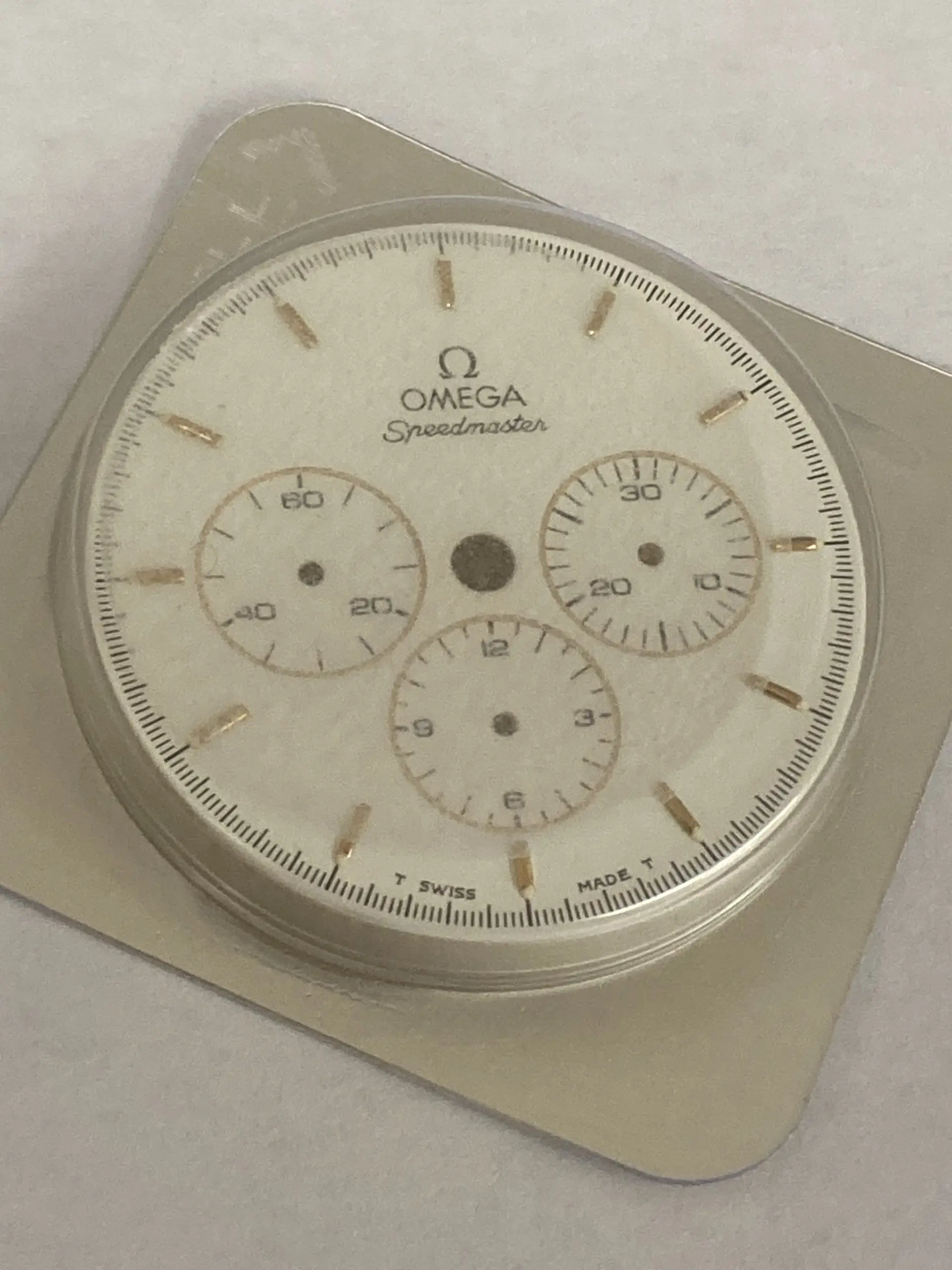 Genuine Speedmaster White & Gold Teutonic Dial. New in sealed package. Fits Omega case 145.040/movement 861.