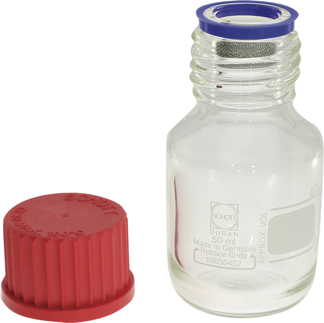 Glass bottle for Epilame with a built in steel mesh basket for holding small parts. Use with Moebius Fixodrop or other epilame. With your epilame fluid in the bottle place your watch part in the steel mesh basket and insert in the top half of the bottle. Replace cap and turn up side down to immerse.