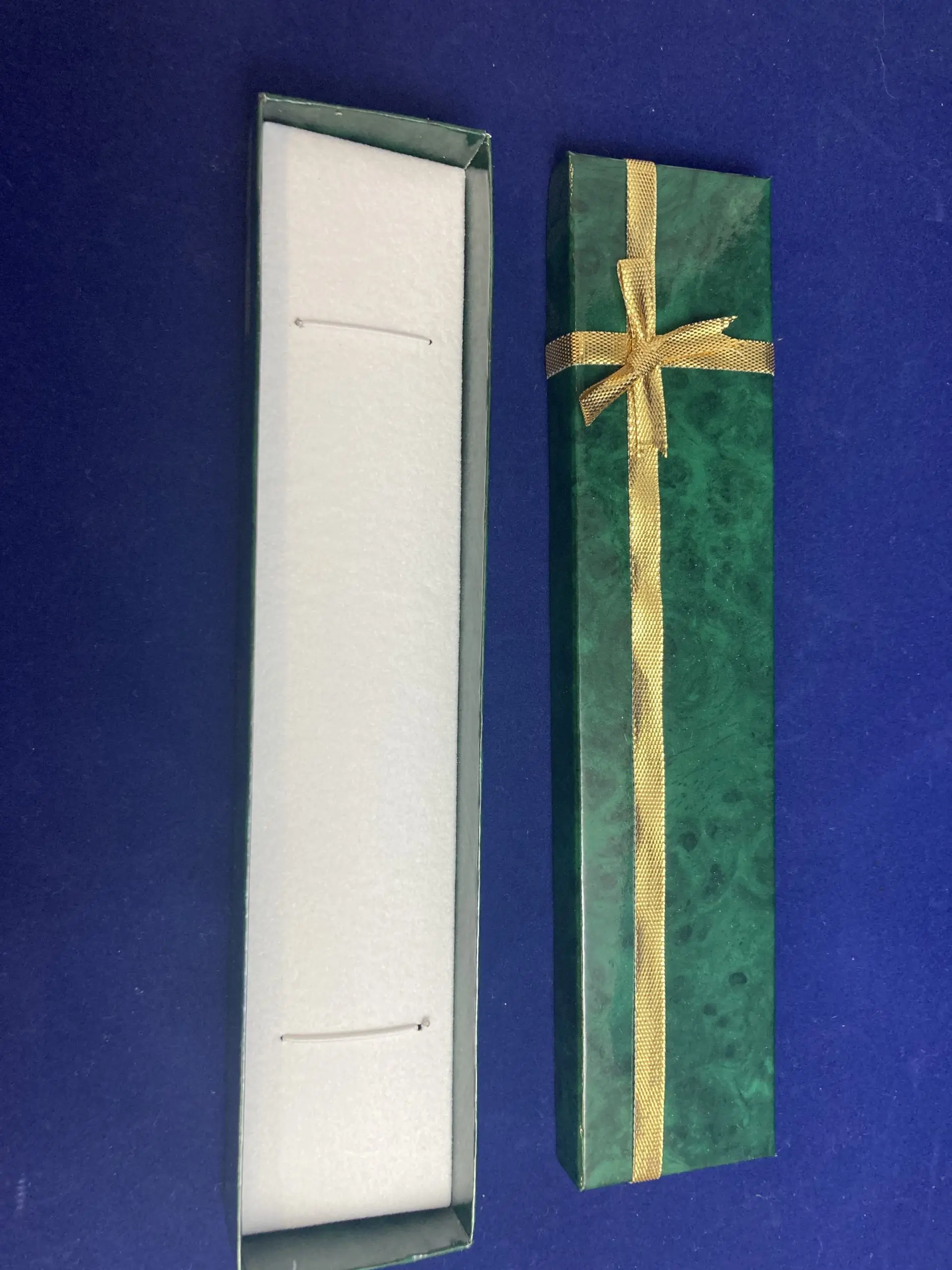 Green Marble Cardboard Bracelet Box with Gold Bow. Size: 8″ x 1 3/4″ x 1″. Sold by the dozen