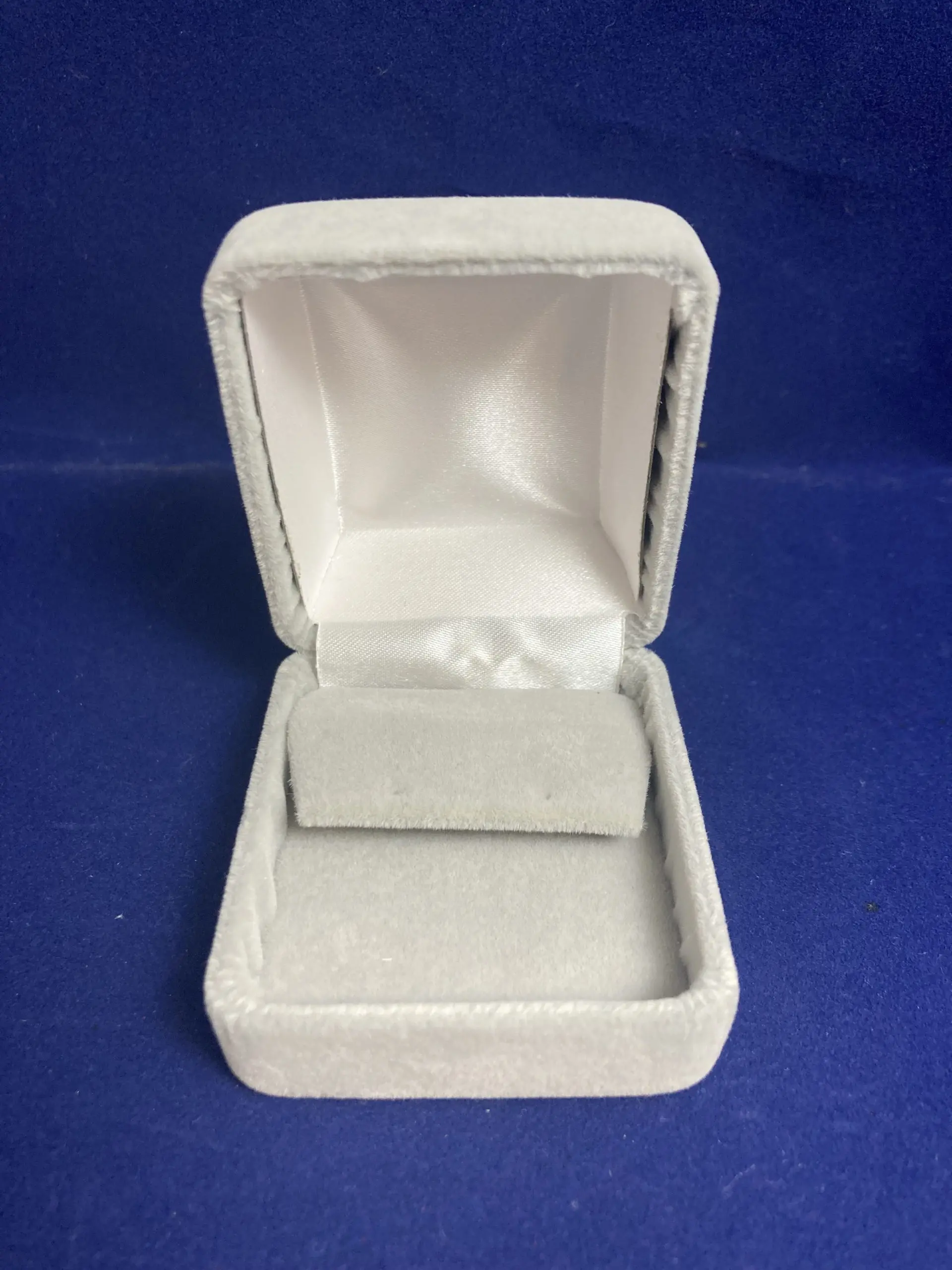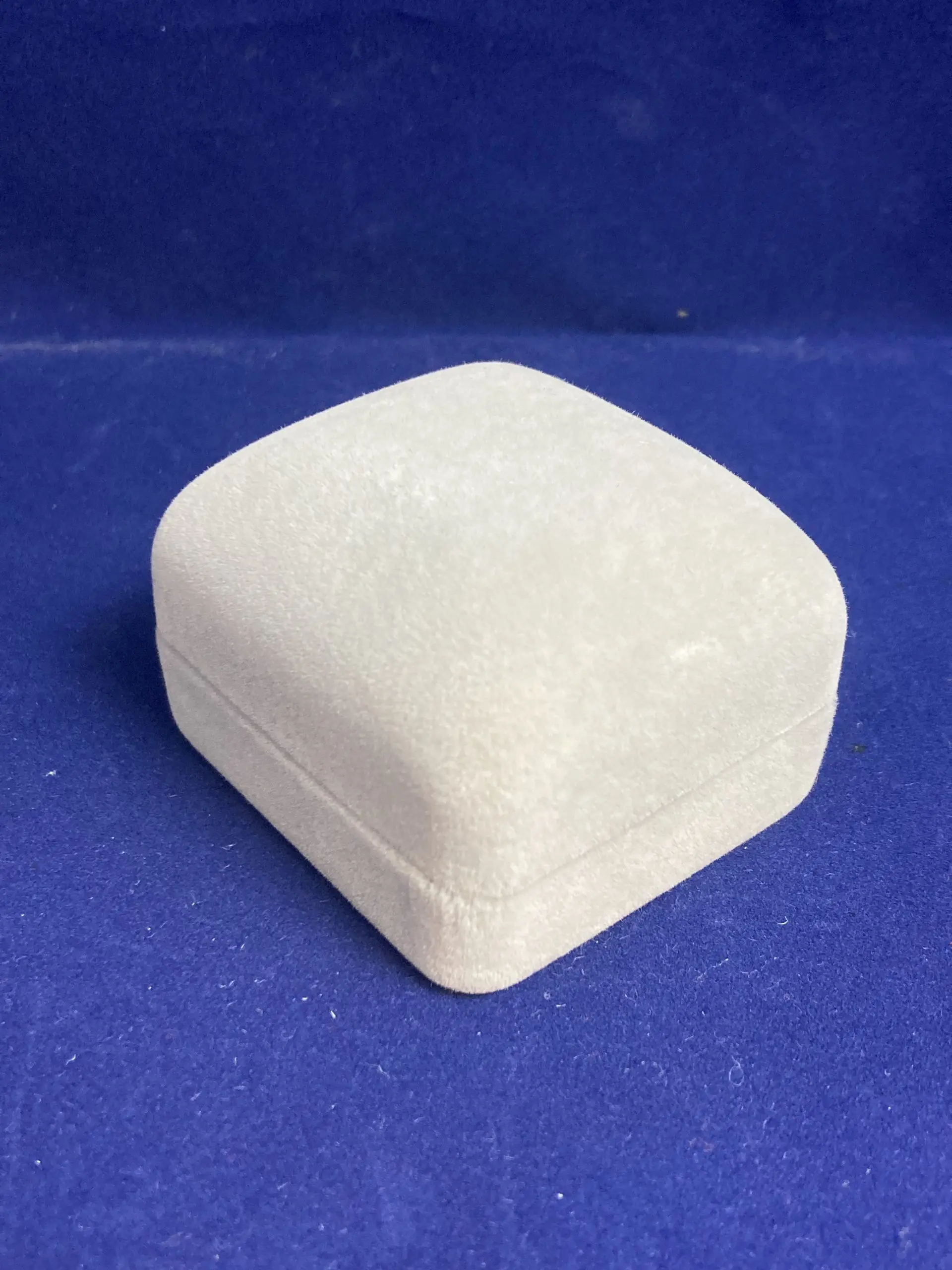 Grey Velvet earring box with hinge. White satin lining. Sold by the dozen. Size: 2 1/8 x 1 7/8 x 1 1/2″.