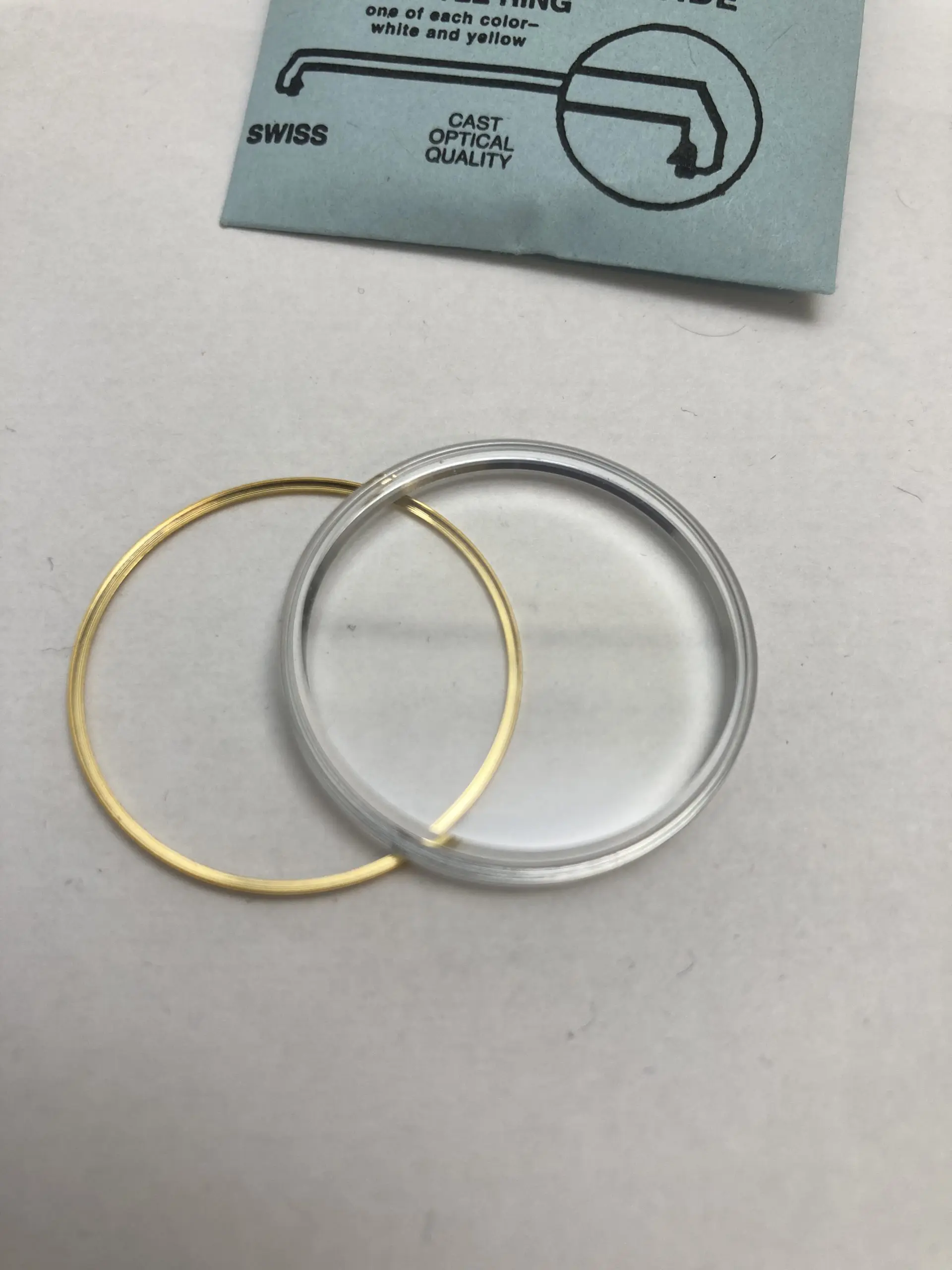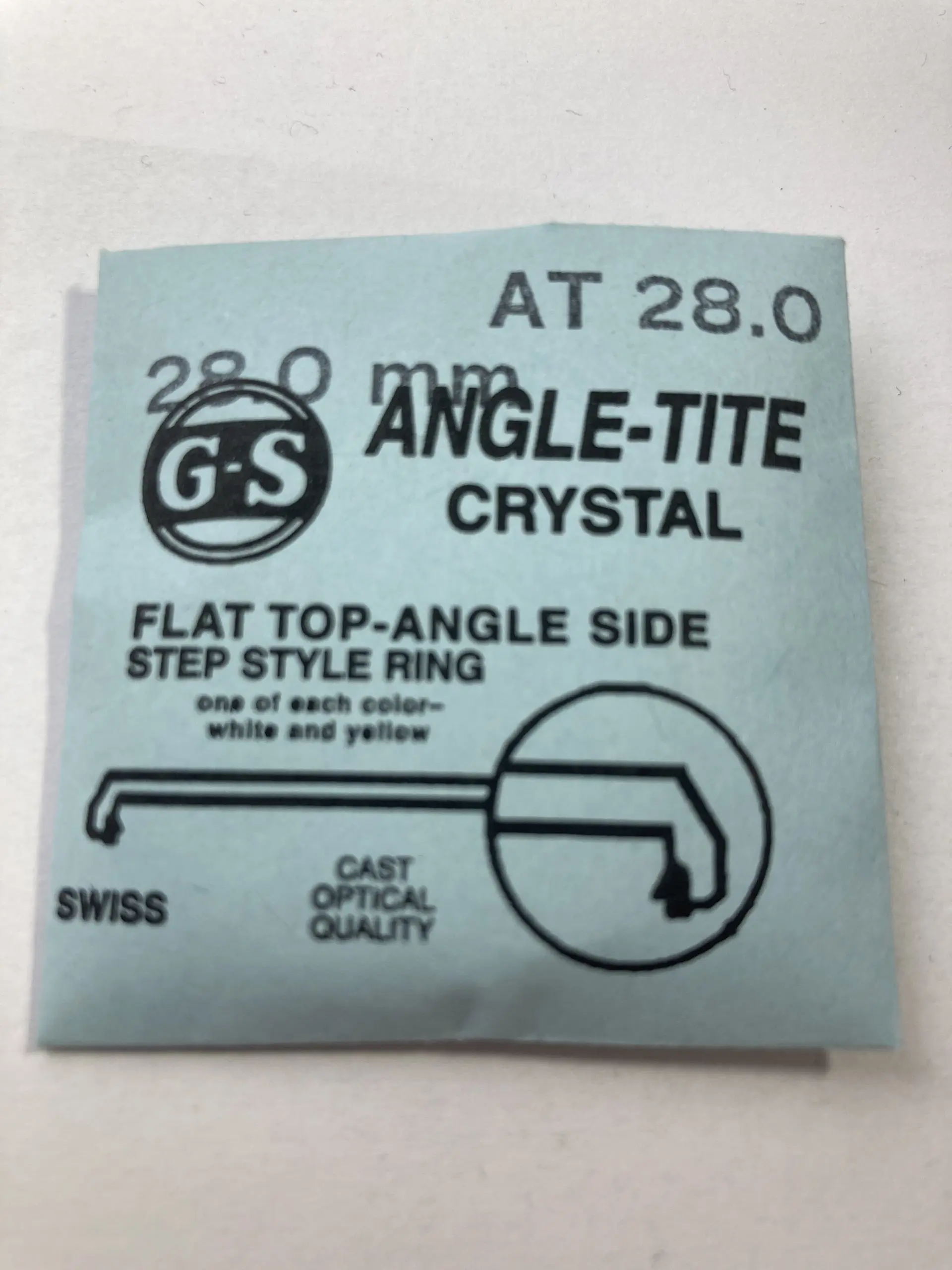 GS Watch Crystal AT Angle-Tite.   Available in diameters from 15-35 mm in .10 mm increments.  Includes a white and yellow step style reflector ring that allows the crystal to snap into place.   Popular replacement for Seiko crystals.  Plastic crystal is designed to be compression fit, but can be glued in also.