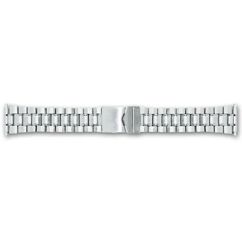 Hadley Roma Wide Link Stainless Steel Men’s Watch Band. Brushed finish with polished accents. Straight ends with squeeze to fit 20-26mm.