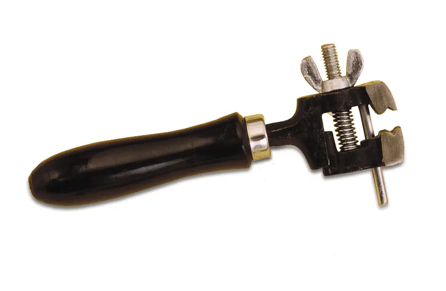 A lightweight vise mounted in a wood handle. Smooth jaws are 1-1/4″ wide and open to 1″. Overall length is 6-1/4″.