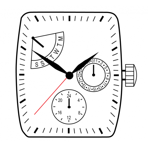 31 day calendar at 3:00, 24H display at 6:00, Retrograde Day
