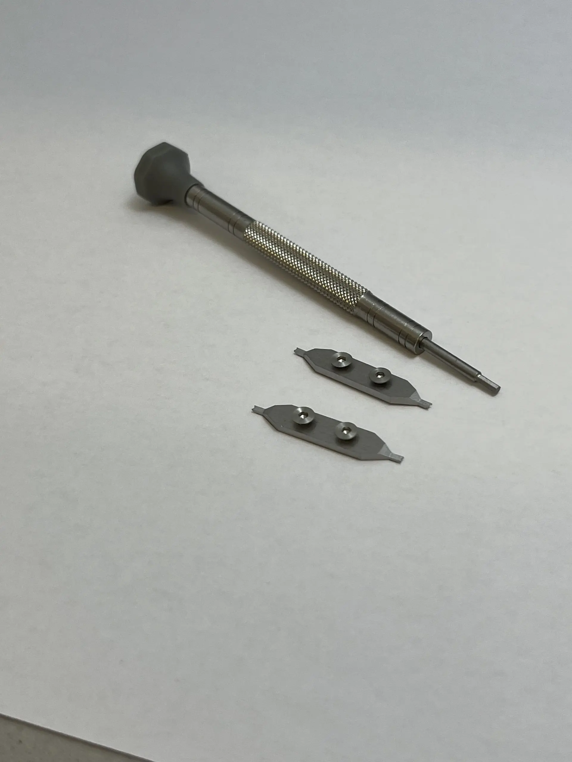 Easily removes spring bars without having to take off the clasp. Angled for easier use. Tips are reversible, with an extra pair included. Hex driver to change tips included.