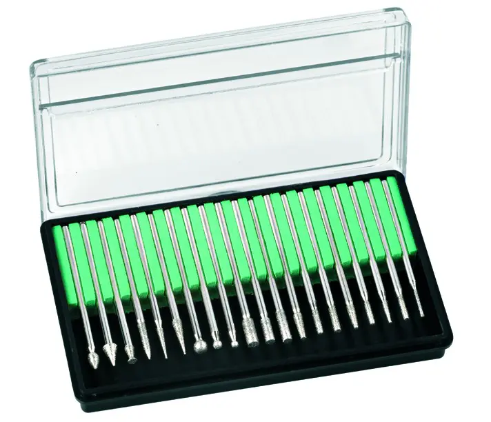 Assortment of 20 diamond burs. A variety of shapes available for multiple uses. Chinese made.