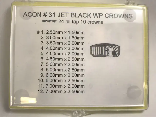 Jet Black Waterproof Crown Assortment, 24pcs. All crowns tap 10. Crown diameters from 2.5-7.0mm. 2 pieces each size.
