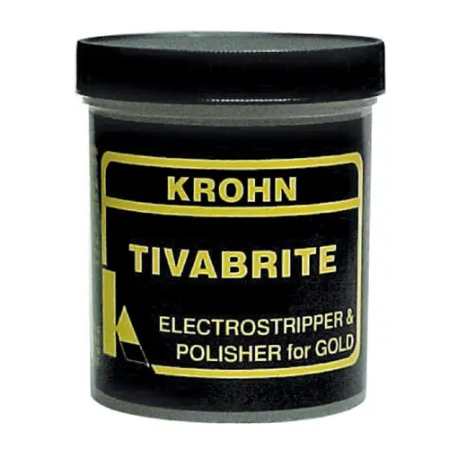 Krohn Tivabrite is an electrostripper and polisher for yellow gold. In most cases, it can replace “bombing”, in a hydrogen peroxide/cyanide solution, with better results. Tivabrite gets into spots, crevices, and undercuts that are impossible to reach with a polishing buff.
