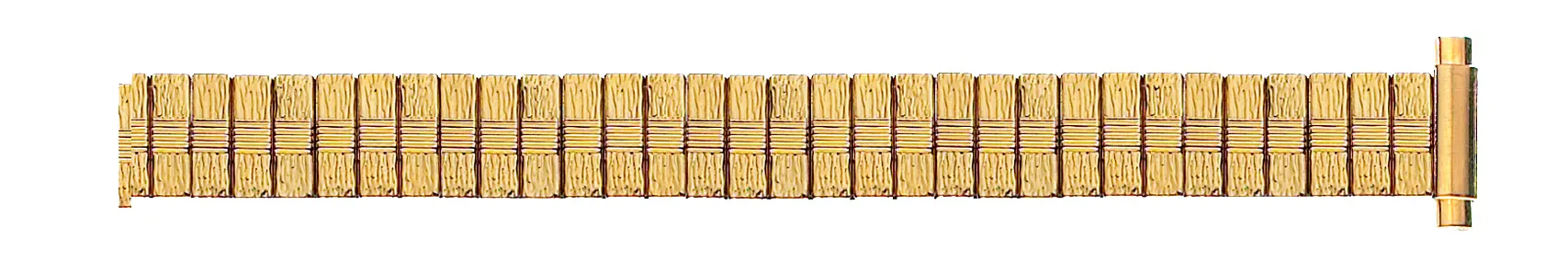 Yellow plated satin edge links and shiny center links. The band has an 11mm body width and the straight ends squeeze to adjust to fit women’s 10mm-14mm watch sizes.