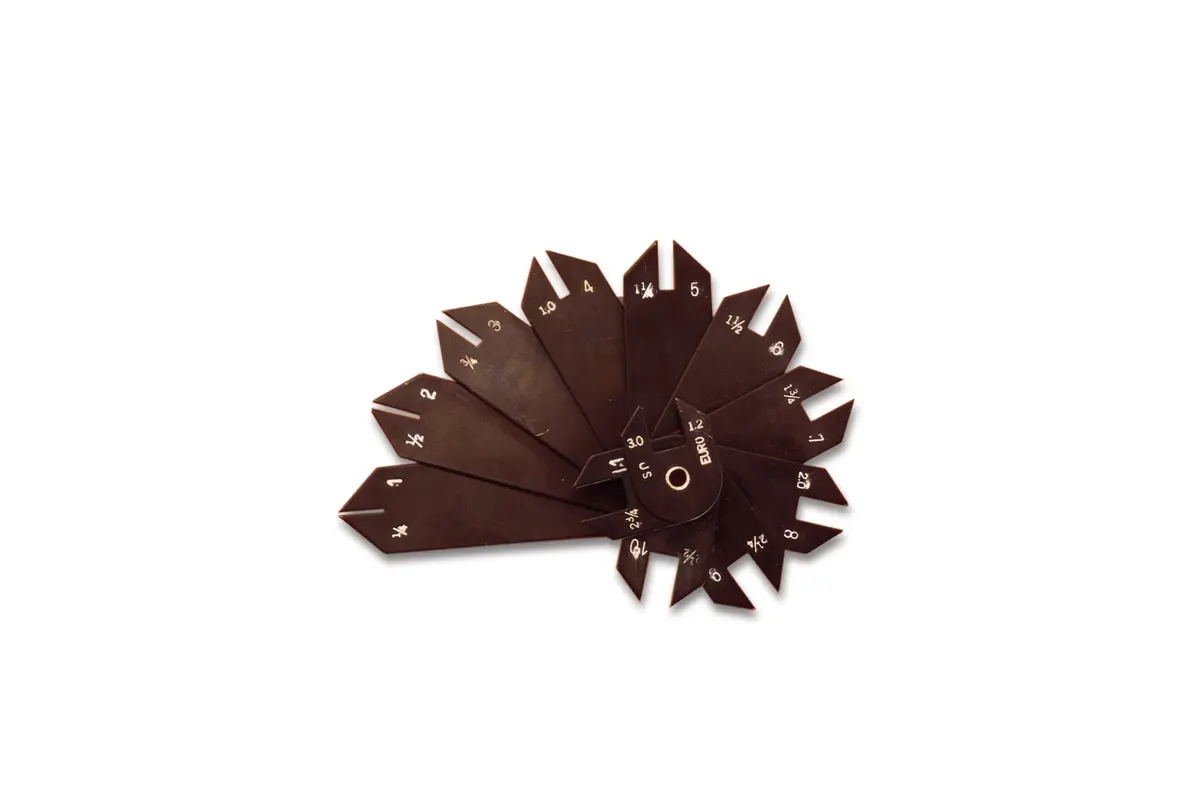 Enables you to accurately scribe cutting lines when reducing ring sizes. The 12 sizes are graduated in quarter ring sizes from 1/4 to 3. Mark and cut the correct size every time. Hardened steel with sharp edges. Fan folds when not in use to protect edges.
