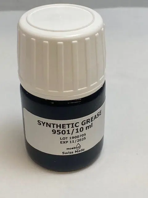 Synthetic Grease #9501 (Rolex 2913) Dark blue synthetic grease from Moebius is for slow moving, time setting steel frictions. ETA recommended. 10cc
