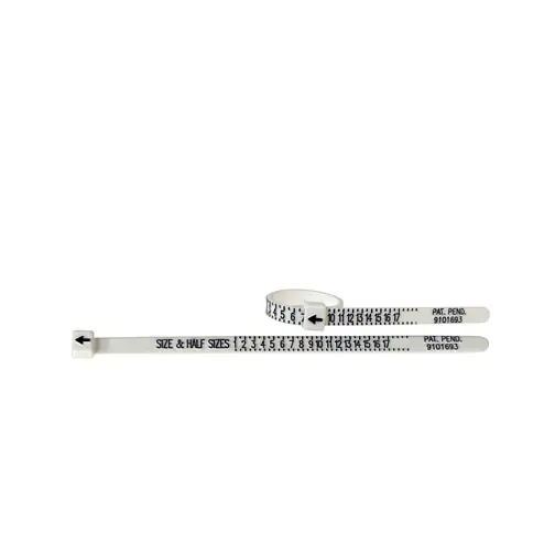 The Multisizer works like a belt with a buckle, which easily wraps around the finger, going over the knuckle. When you tighten it into a comfortable fit, an arrow indicates the precise finger size.