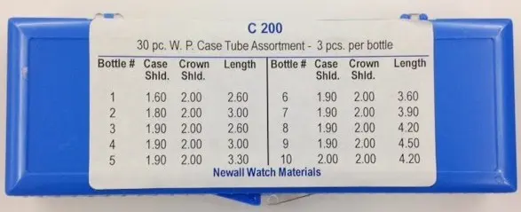 Newall Waterproof Case Tube Assortment, 30 pieces. 3 pieces each size. Crown post size 2.0mm. Refills available separately.