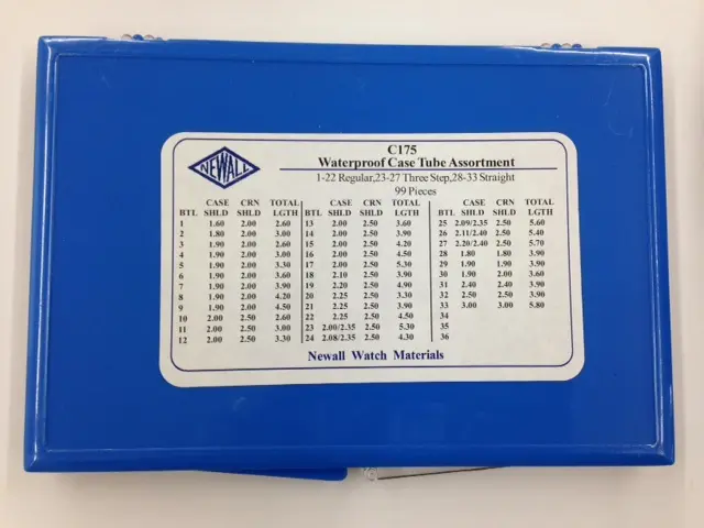 Newall Quality Waterproof Case Tubes. 33 different sizes, 3 pieces each size to fit most watch cases.