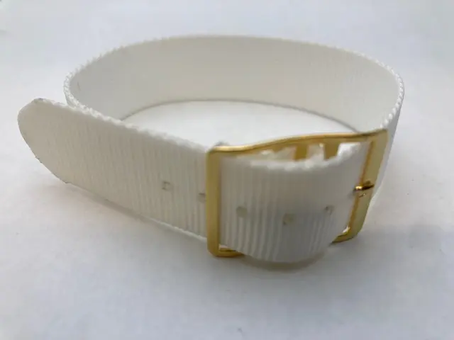 Nylon One Piece Watch Strap White w/Gold Buckle. 12mm & 18mm Available
