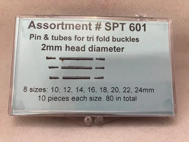 Pin & Tubes for Tri-Fold Buckles Assortment, 80 pieces. Sizes: 10, 12, 14, 16, 20, 22, 24mm. 10 pieces each size.