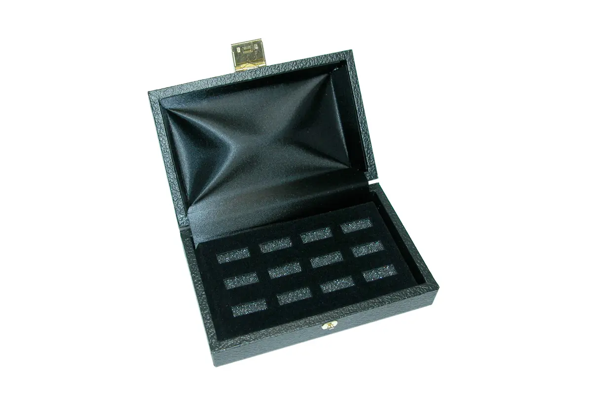The high contrast and sophistication of black get results in sales. The vibrant black velvet trays and cases prove that impressive and effective displays need not be expensive. Cases are wood, covered in textured black vinyl, with simply designed metal latches. Slotted black foam under the velvet inserts hold rings firmly in place. Covers are lined in black satin. Trays have decorative gold tooling around the edges.