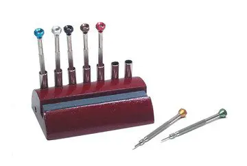 Polished hardwood stand (for set of seven screwdrivers, numbers 3 to 9 for baguette and pocket sizes) with carborundum sharpening stone built into base and a side compartment for spare blades. Designed especially for watchmakers. Nickel-plated to prevent rust.