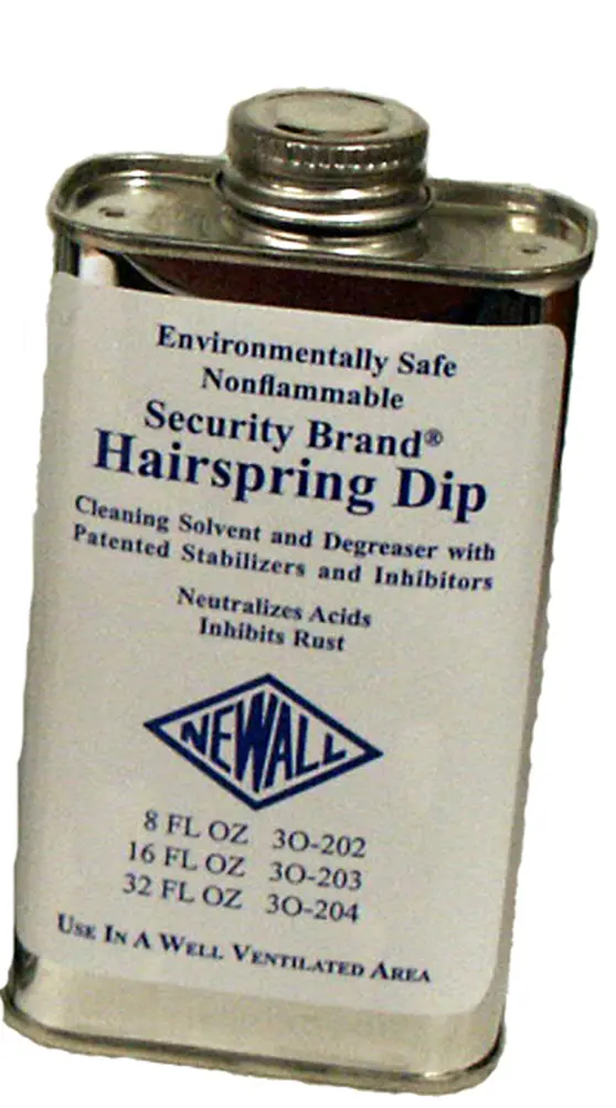 This Security Brand® hairspring dip cleaner is a non-flammable, environmentally-safe cleaning solvent and degreaser with patented stabilizers and inhibitors to neutralize acids and prevent rust. It removes oils, grease, wax, adhesives, and other contaminants.