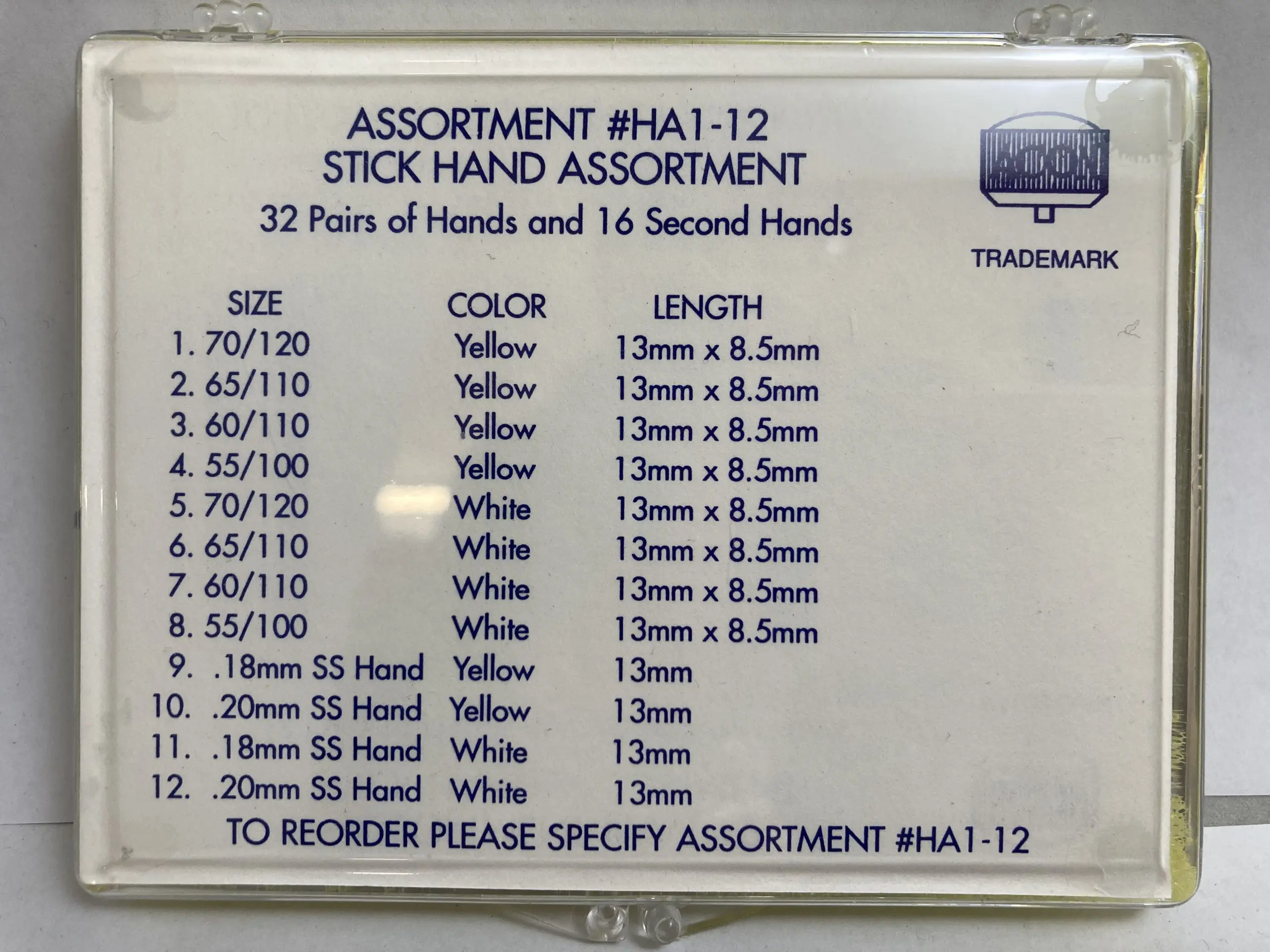 Stick Hand Assortment Hour/Minute/Sweep White & Yellow, 48pcs. Inclues 32prs of hands and 16 Sweep second hands.