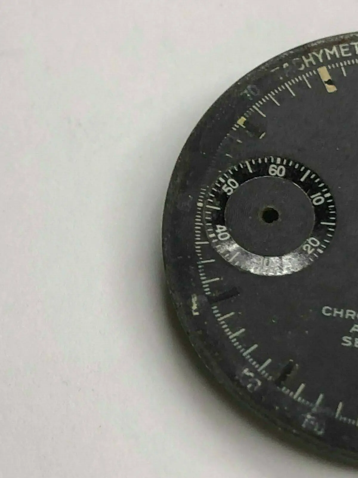 Croton Chronomaster Aviator Sea Diver vintage dial. Dial has wear marks around the edges, the worst of it being on the 9 o’ clock side. Both dial feet are intact and in good shape. Dial measures roughly 28.2mm in diameter. Definitely not the prettiest girl at the ball, but still a cool dial for a cool watch. Let me know if you have any questions, before purchasing.