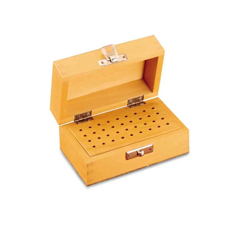 This wooden bur box is designed with a hinged lid and clasp closure to ensure that your burs will be secure in this box. There are 36 holes drilled into the box where you can place your burs to keep them organized and easy to find. This is the perfect way to store your burs.