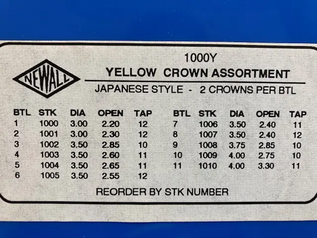 Yellow Japanese Style Waterproof Crown Assortment. 11 sizes, 2 pieces each size. Taps 10, 11 & 12.