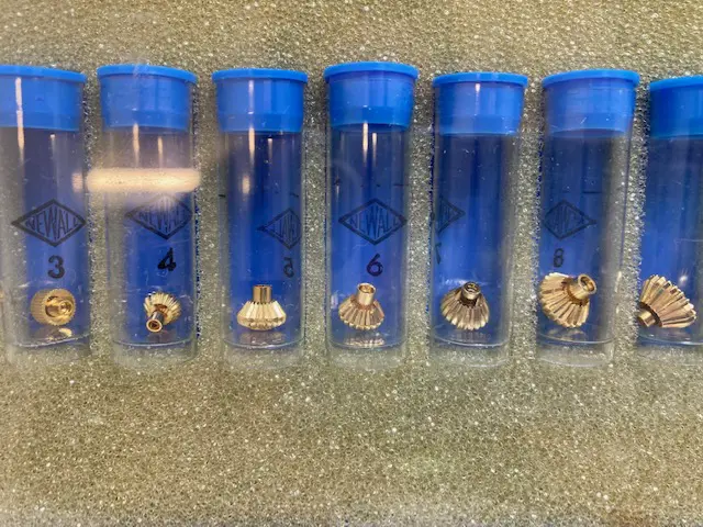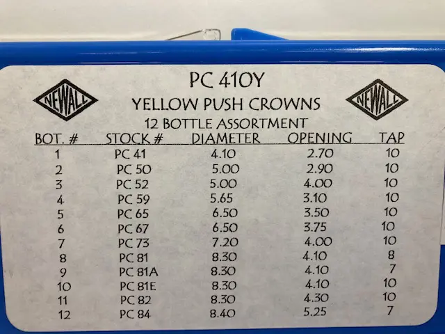 Yellow Pusher Crown Assortment, 12 pcs. Great for vintage repair work. Diameters 4.10-8.40mm.